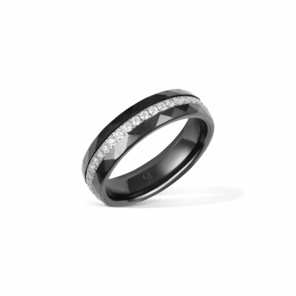 טבעת לגבר שחורה עם חיתוכי לייזר ושיבוץ זרקונים