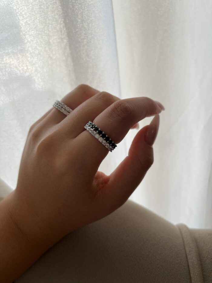 חווי את היוקרה והברק של טבעת הטניס הכפולה המרהיבה הזו, משובצת באבני זרקון שחורות ולבנות. עשויה מכסף סטרלינג 925, טבעת זו משדרת נוכחות מרשימה ועדינה בעת ובעונה אחת. השילוב המנצח של שחור ולבן מקנה לה מראה אלגנטי ומודרני, מושלם לכל אירוע מרשים או ללבוש יומיומי.