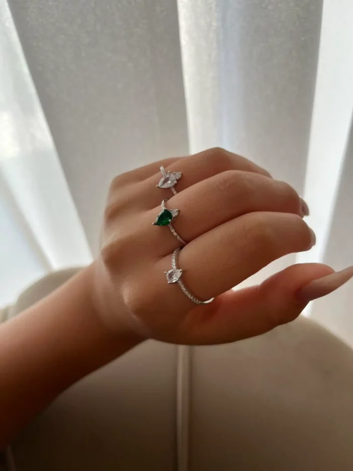 ✨ טבעת היהלום "Lumière " היא פסגת האלגנטיות והזוהר. עם עיצוב מעודן ודקיק, הטבעת משובצת באבן זירקון מרכזית בצורת טיפה המעניקה לה מראה ייחודי ומהפנט. השילוב של אבני זירקון קטנות בצידי הטבעת מוסיף לנצנוץ וליוקרה שלה 🌟.