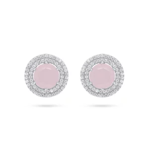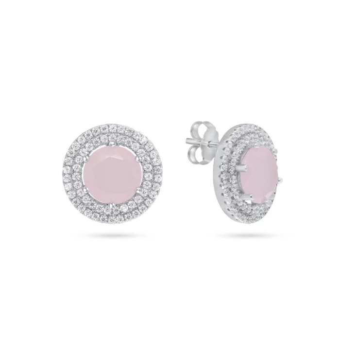 עגילים אלגנטיים ועגולים בעלי נוכחות רכה וזוהרת, עם אבן מרכזית ורודה בגימור חלק ועדין, מוקפת בשתי שורות צפופות של אבני זירקון נוצצות. שילוב של רוך, יוקרה ונשיות, המתאים לכל הופעה – יומיומית או חגיגית.
