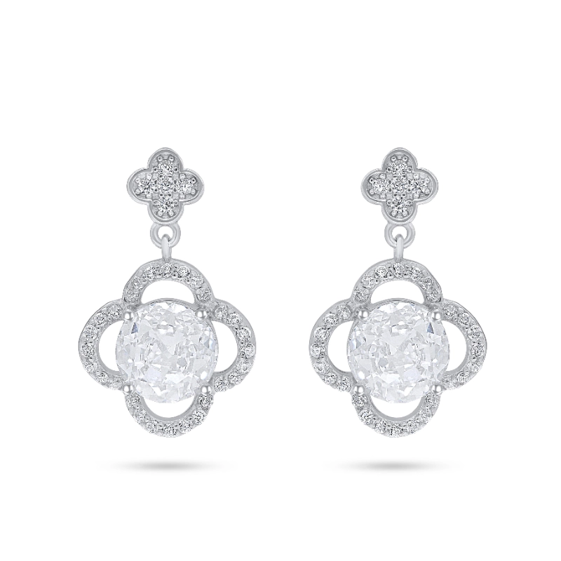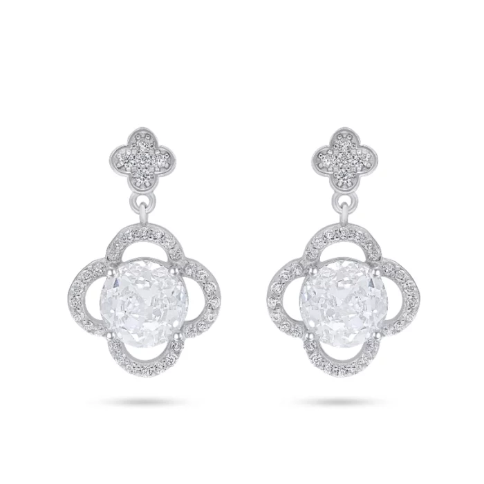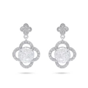 עגילים תלויים מעודנים בעיצוב פרח ויקטוריאני מהמם, משובצים אבן מרכזית עגולה בולטת ומוקפים במסגרות פתוחות עם נגיעות מנצנצות של זרקונים שקופים. החלק העליון בעיצוב עלי כותרת משלים את הלוק הרומנטי והיוקרתי.