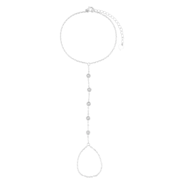 צמיד כסף ייחודי בסגנון Hand Chain , המחבר בין פרק כף היד לאצבע. לאורך השרשרת משובצים זירקונים עגולים נוצצים היוצרים מראה אלגנטי וזוהר במיוחד. תכשיט אופנתי עם נוכחות – מושלם לאירועים מיוחדים ולמראה ערב יוקרתי.