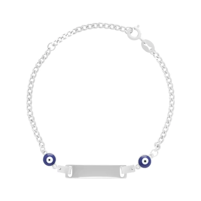 צמיד כסף עדין לתינוק/ת עם פלטה חלקה המיועדת לחריטה אישית (שם או תאריך), משולבת בשני תליוני עין כחולה להגנה ושמירה. מתנה מושלמת ללידה, ברית או בריתה.