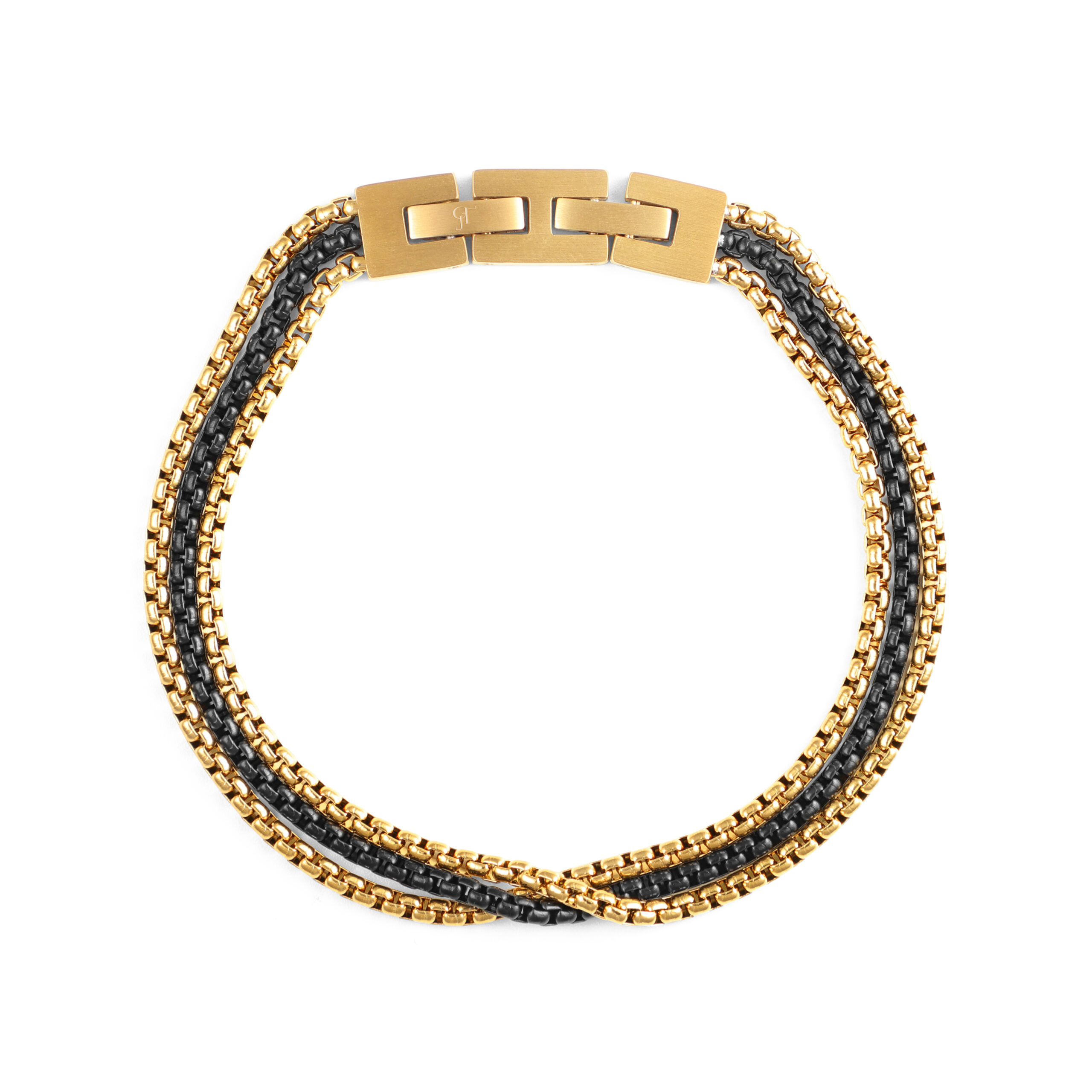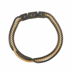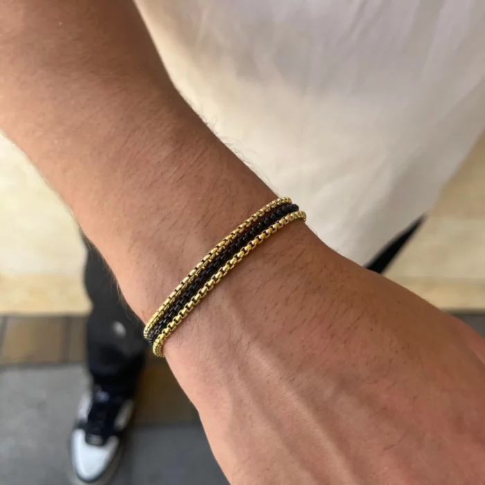 צמיד גברים יוקרתי מבית עם עיצוב שלוש שורות אלגנטי בצבעים זהב, כסף ושחור. שילוב ייחודי של חוליות מתכת מעניק מראה מודרני ומלא סטייל, המתאים לכל סגנון – יומיומי או רשמי. צמיד זה מושלם לאלו שמחפשים נגיעה אופנתית ויוקרתית לכל הופעה, ונוח לענידה למשך כל היום.✨✨