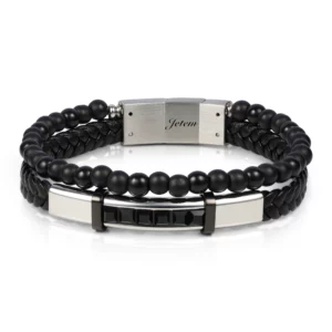 צמיד גברי ואלגנטי המשלב עור קלוע וחרוזים שחורים עם אלמנטים ממתכת בצבע שחור וכסף. עיצוב מתוחכם ומודרני המשדר יוקרה ומסוגננות. הצמיד מתאים לכל הופעה, משדרג את המראה היומיומי וגם משתלב באירועים מיוחדים. ✨