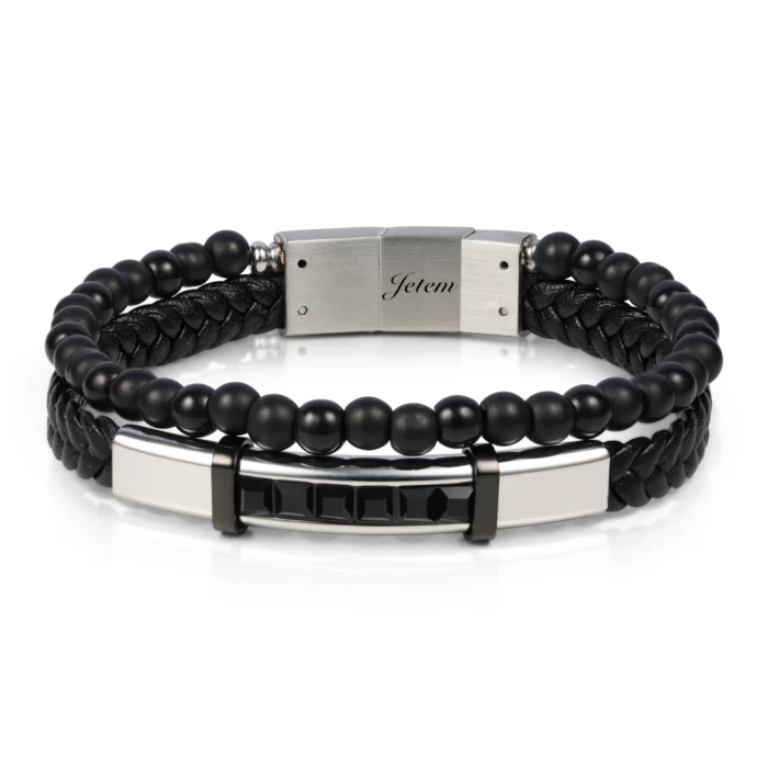 צמיד לגבר שילוב עור וחרוזים בשחור בעיצוב מודרני