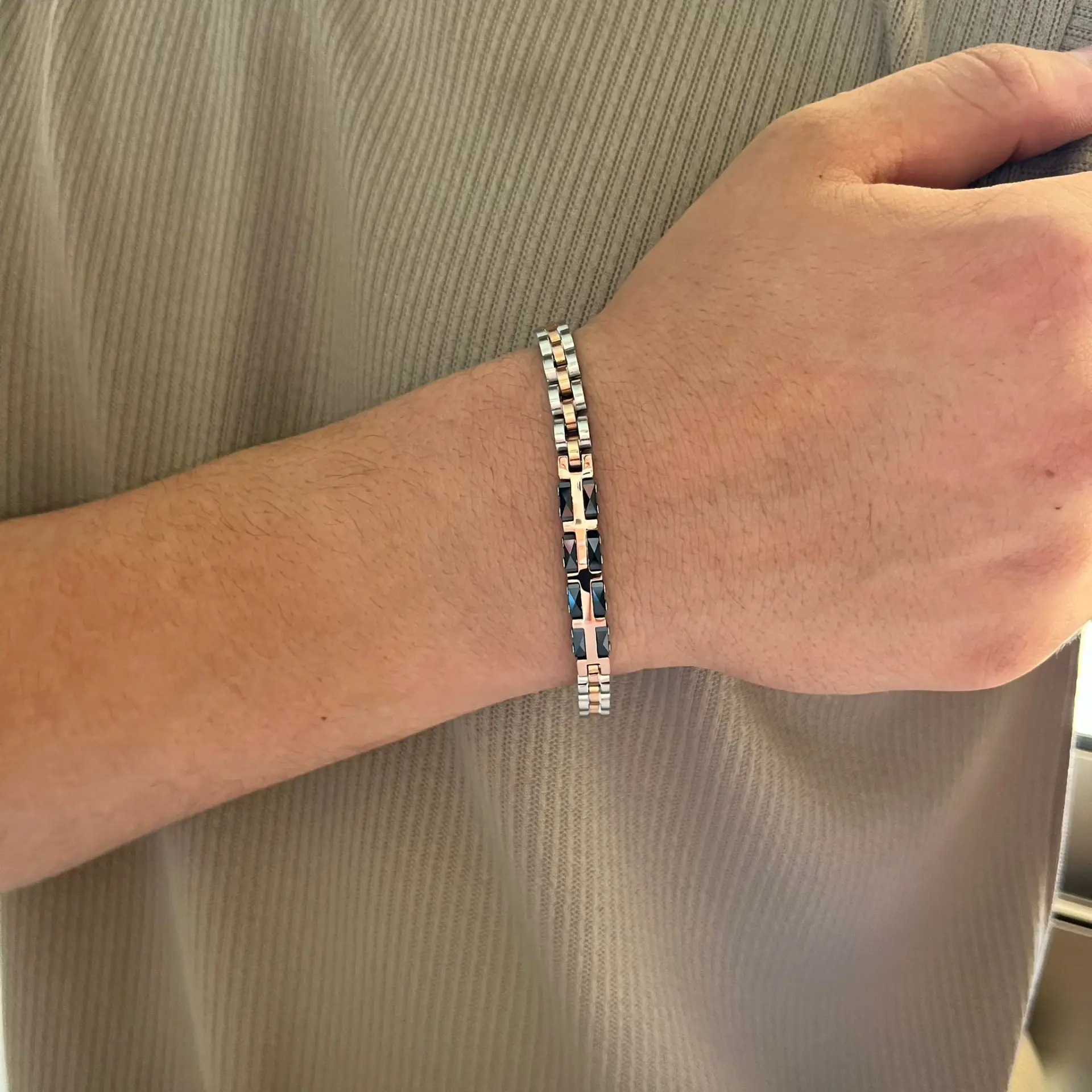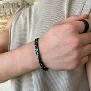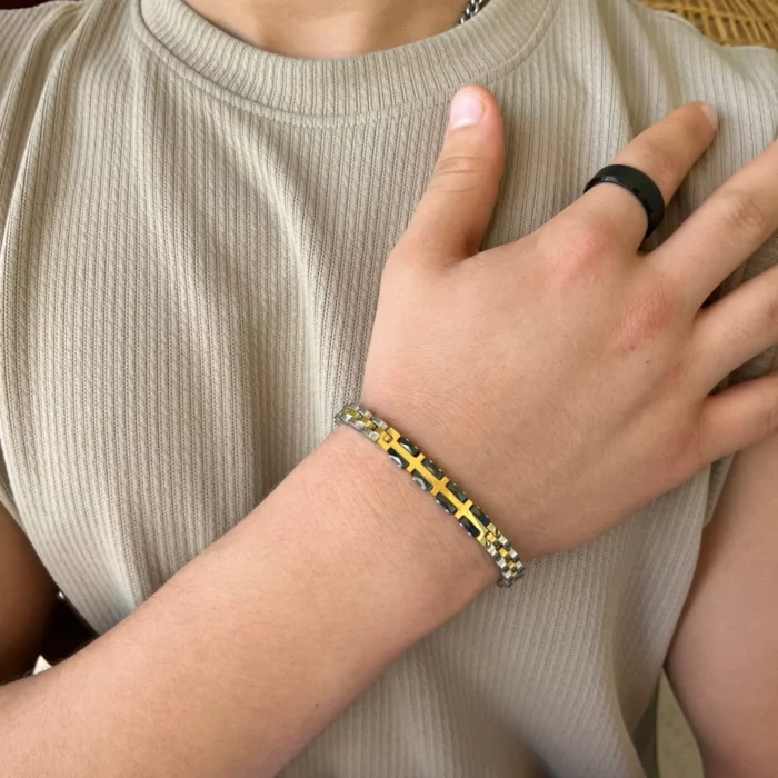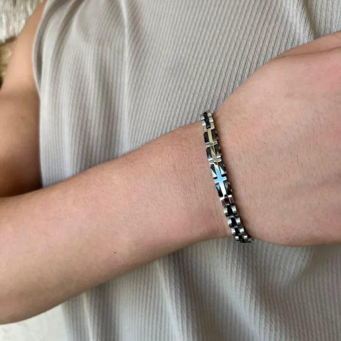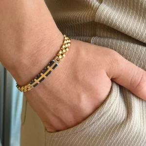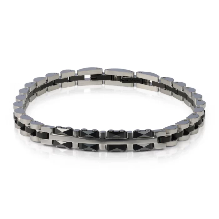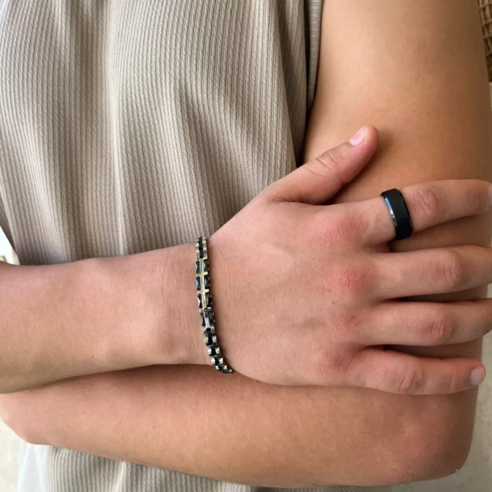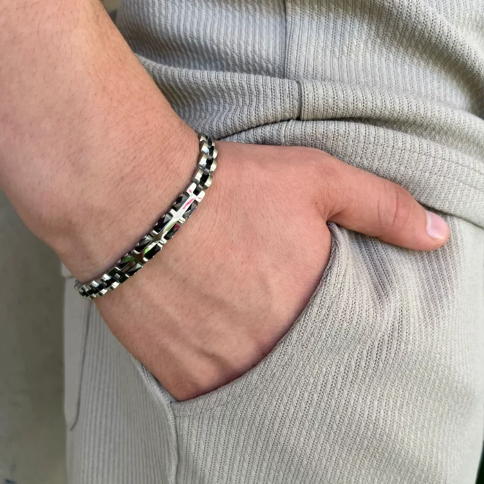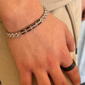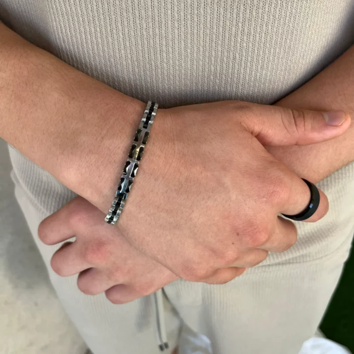 צמיד זה, משולב עם קרמיקה שחורה, הוא תכשיט מושלם לגבר המחפש לשלב בין אלגנטיות למודרניות.