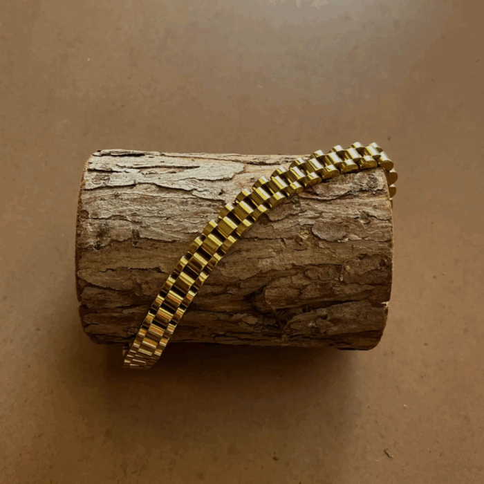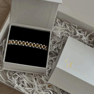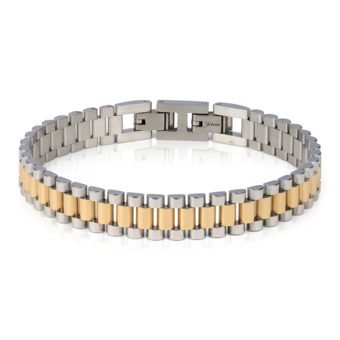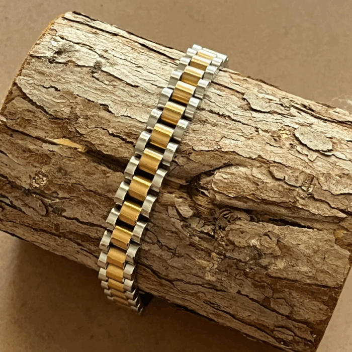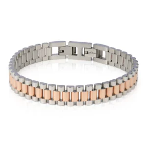 הצמיד המושלם לגבר המודרני – "צמיד לגבר מבית ". עיצוב יוקרתי המשלב פלדת אל חלד עמידה בשילוב פסים בציפוי זהב, ליצירת מראה אלגנטי ונקי. סוגר הכפול המבטיח נוחות וביטחון בלבישה. צמיד זה מעניק מגע של יוקרה לכל מראה ומתאים לכל אירוע – בין אם ביום יום ובין אם באירועים מיוחדים. אל תפספסו את ההזדמנות להוסיף את פריט הסטייל הזה לאוסף שלכם!