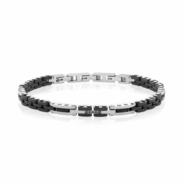 ✨ צמיד יוקרתי בעיצוב עכשווי, המשלב חוליות בצבע שחור מטאלי עם נגיעות כסף מבריקות. במרכזו אלמנט עדין המשובץ באבנים שחורות קטנות, המוסיף טאץ' מתוחכם ומלא עוצמה. הצמיד משדר סגנון גברי, אלגנטי ונוכחות בולטת – הבחירה המושלמת ליום-יום וגם לאירועים מיוחדים.