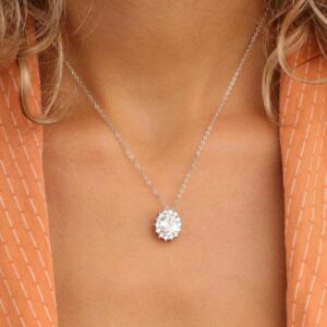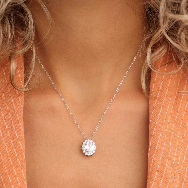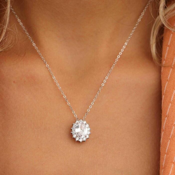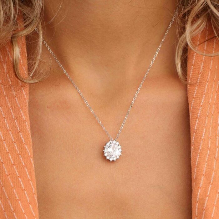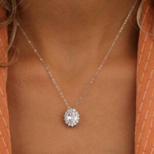 השלימי את ההופעה שלך עם שרשרת מרהיבה זו, המעוטרת בתליון יוקרתי בעיצוב אליפסה, המצופה ברודיום לשמירה על הברק ועמידות לאורך זמן. התליון משובץ באבן מרכזית נוצצת, מוקפת בעיטור אבנים קטנות שמוסיפות זוהר ואלגנטיות לכל הופעה.