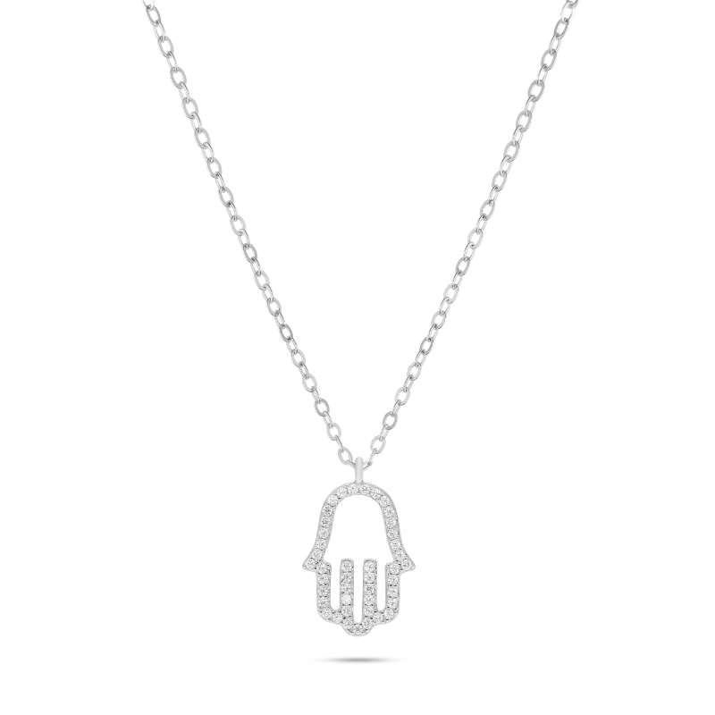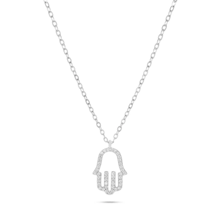 שרשרת כסף עדינה עם תליון חמסה חלולה המעוצבת בקווים נקיים ומשובצת אבני זירקון קטנות ונוצצות. החמסה מסמלת הגנה וברכה, והעיצוב האלגנטי מתאים לכל הופעה – יומיומית או חגיגית.