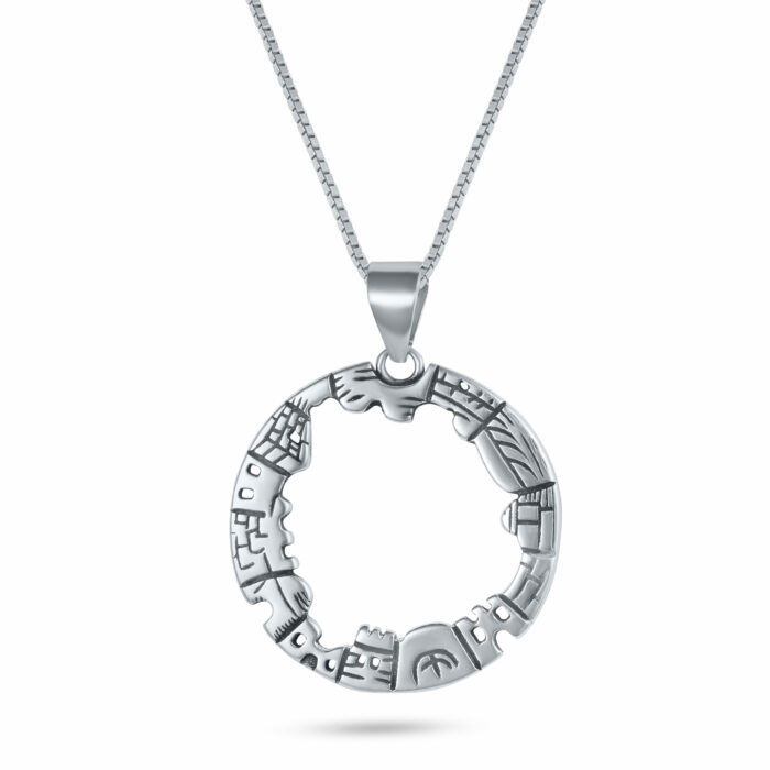 תיאור מוצר: תליון עוצר נשימה המעוצב בהשראת נופי ירושלים הקסומים. ✔️ עיצוב מעגלי ייחודי המשלב אלמנטים מהעיר העתיקה. ✔️ עשוי מכסף 925 איכותי עם רמת גימור גבוהה. ✔️ מסמל חיבור עמוק להיסטוריה ולמורשת היהודית. ✔️ מתנה מושלמת לחובבי העיר ירושלים ולאוהבי סמלים משמעותיים.