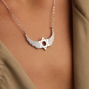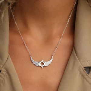 שרשרת ייחודית המשלבת בין עוצמה לרוחניות, עם תליון מגן דוד מעוטר בכנפיים אלגנטיות המשובצות זרקונים נוצצים. עיצוב מלא השראה שמביא איתו מסר של חיבור, אמונה וחופש.