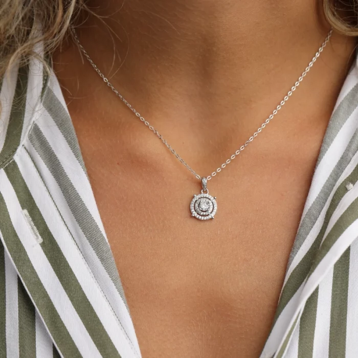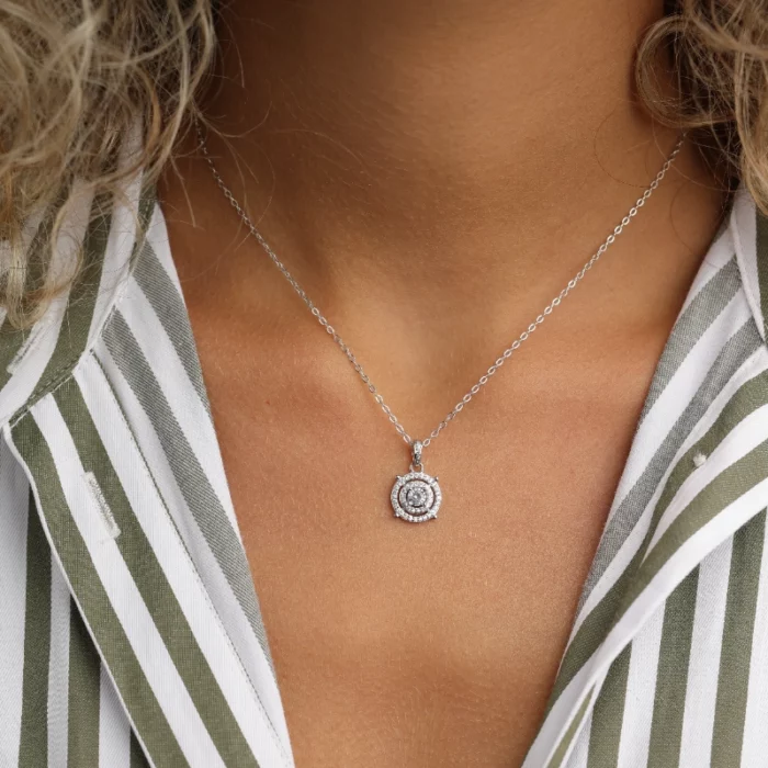 שרשרת עדינה ומרשימה מכסף 925, עם תליון עגול מעוצב בקפידה ומשובץ אבני זירקוניה נוצצות. העיצוב הקלאסי והנוצץ הופך את התכשיט לאידיאלי לאירועים מיוחדים וגם לשימוש יומיומי, תוך הענקת טאץ' יוקרתי לכל הופעה. השרשרת בעלת גימור מלוטש ומדויק, המשלימה מראה אלגנטי ושובה עין.