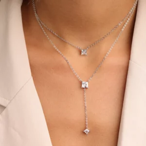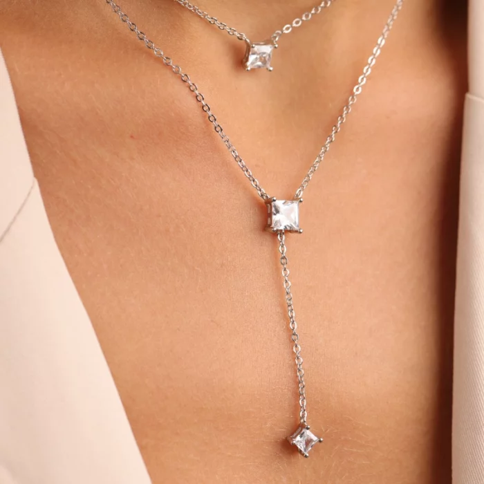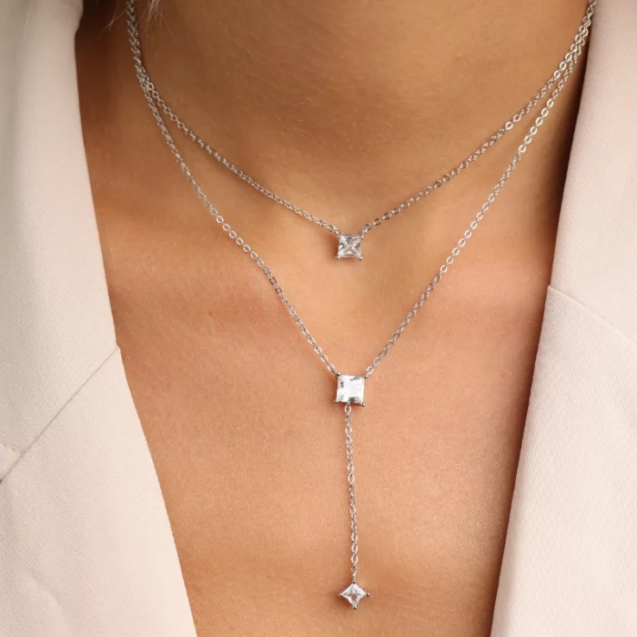 שרשרת כסף עניבה שתי שורות תליון סוליטר ריבוע