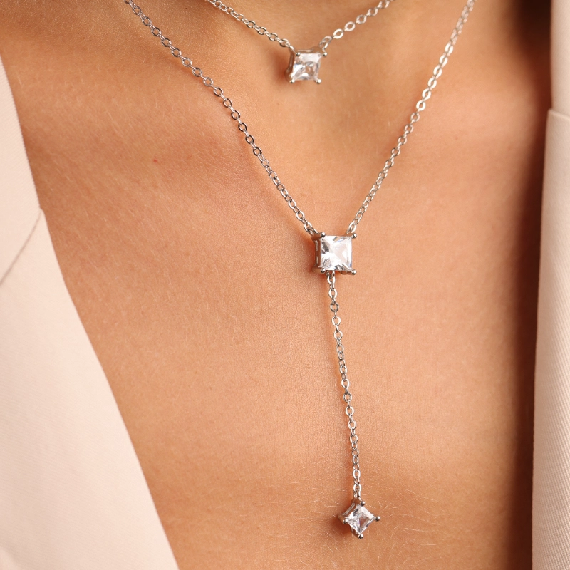 עמוד הבית כל השרשראות שרשראות עניבה שרשרת כסף עניבה שתי שורות תליון סוליטר ריבוע