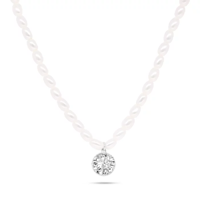 השרשרת שמשלבת אלגנטיות קלאסית עם נגיעה מודרנית. פנינים לבנות ועדינות יוצרות מראה יוקרתי ונשי, ובמרכזן תליון עגול עם זירקוניה בוהקת שמוסיף נצנוץ עדין ומרשים.