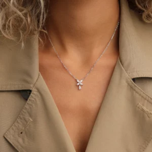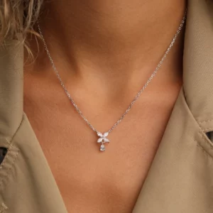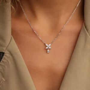 שרשרת ייחודית בעיצוב פרחוני, שמשדרת עדינות ונשיות עם נגיעות של יוקרה. הפרח המשובץ בזרקונים נוצצים יוצר מראה אלגנטי, ואבן הטיפה המשתלשלת מעניקה תוספת של תנועה רכה וזוהרת.