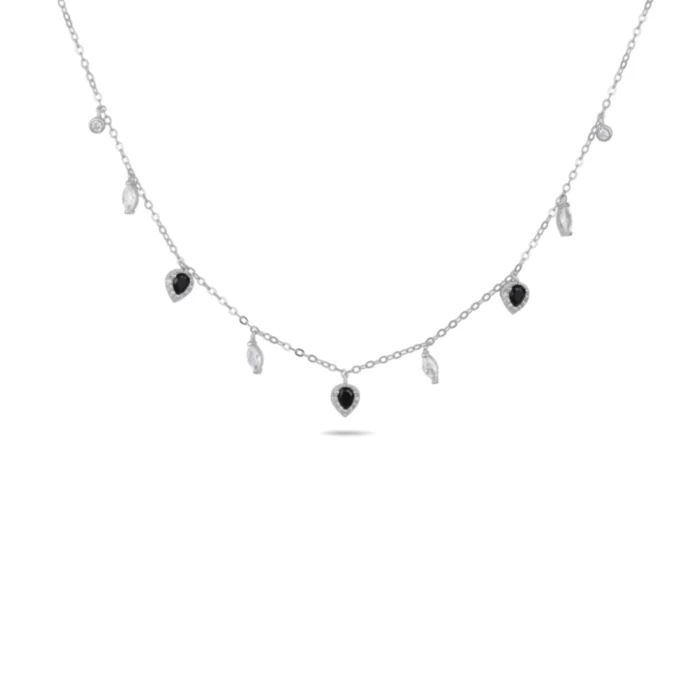 שרשרת צ'וקר מכסף עדינה ויוקרתית המעוטרת באבני חן בצבעים שחור ולבן. השרשרת כוללת מספר תליונים בצורת טיפות עם אבנים שחורות משובצות ואבנים לבנות מבריקות בצורות שונות המשתלבות באלגנטיות לאורך השרשרת. 💫 העיצוב העדין והמוקפד הופך את השרשרת לתכשיט ייחודי ומרשים המתאים למגוון הזדמנויות. ✨
