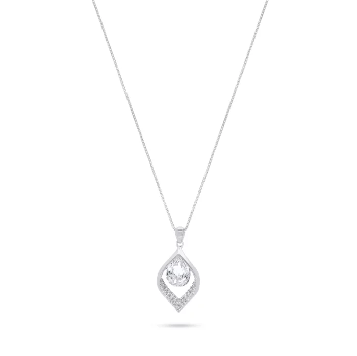 עיצוב אלגנטי, עם מראה עדין אך עשיר – תליון בצורת טיפה שמשלב קווים פתוחים ושיבוץ זרקונים עדין המקיף אבן מרכזית בצורת טיפה.