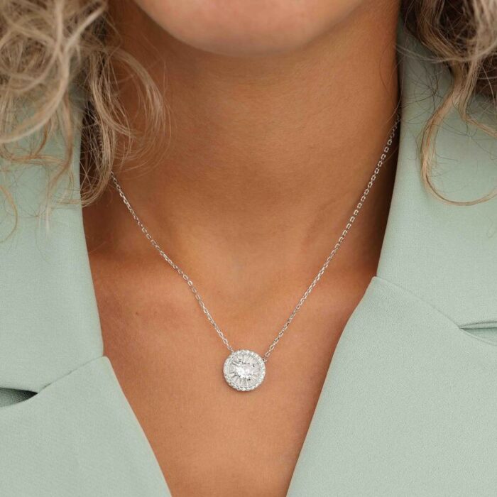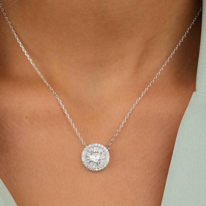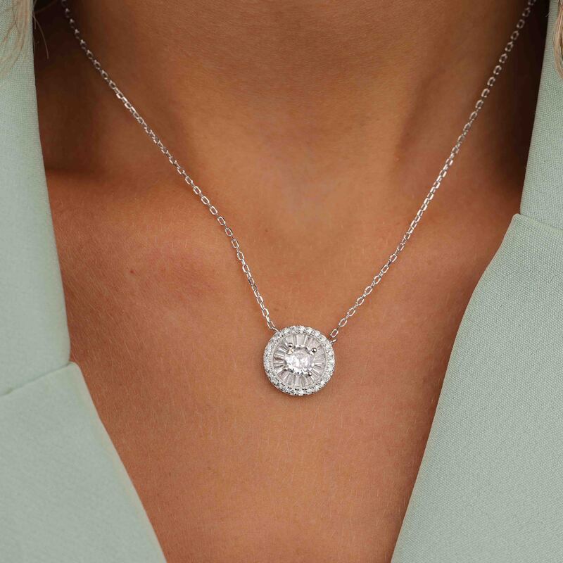 השרשרת שתוסיף לכל מראה שלך זוהר ויוקרה בלתי מתפשרת. עם תליון עגול בעל נוכחות מרשימה, המעוטר באבנים נוצצות שמדגישות את עיצובו היוקרתי. הכסף מצופה ברודיום איכותי, המבטיח ברק מתמשך ועמידות גבוהה, ויוצר מראה אלגנטי ומרהיב שמתאים לכל אירוע.