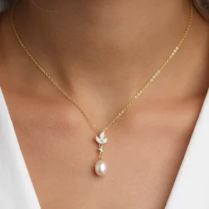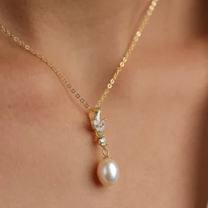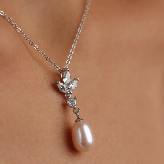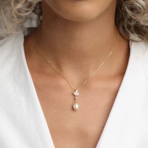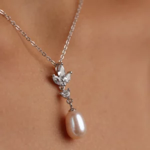 שרשרת נשית ואלגנטית עם תליון פנינה מעודן , המחובר לעלים משובצים אבני זירקון נוצצות . השילוב בין הפנינה הקלאסית והברק היוקרתי של הזירקונים יוצר מראה מרהיב שמתאים לכל אירוע – משימוש יומיומי ועד לאירועים חגיגיים.