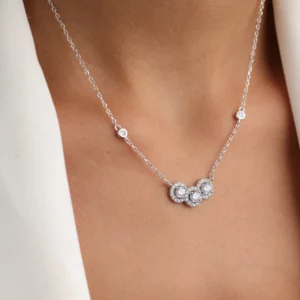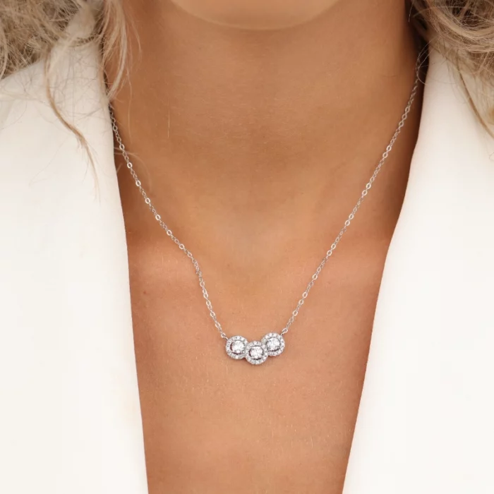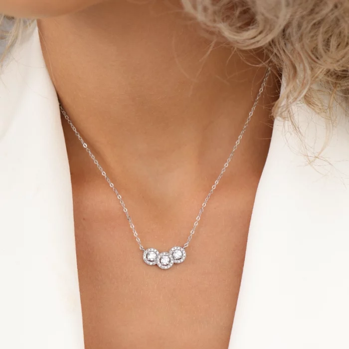 העניקי לעצמך או לאדם מיוחד את המגע המושלם של יוקרה עם שרשרת כסף זו, המשלבת שלושה תליונים עגולים נוצצים שיוצרים יחד מראה ייחודי ומרשים. ציפוי הרודיום על הכסף מבטיח ברק עמיד לאורך זמן ומוסיף מראה אלגנטי ויוקרתי. השרשרת מתאימה ליום ולערב, ומשתלבת נהדר עם כל סגנון לבוש – מהיומיומי ועד לערב נוצץ.