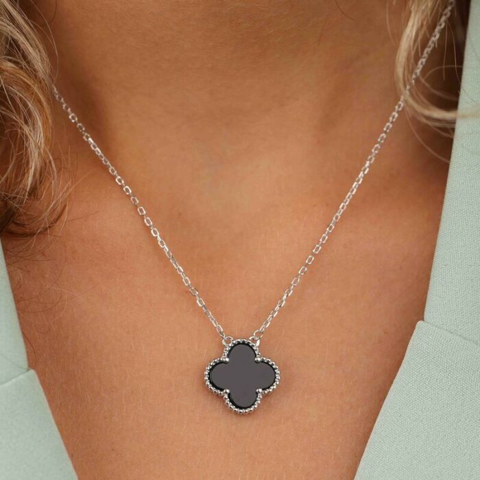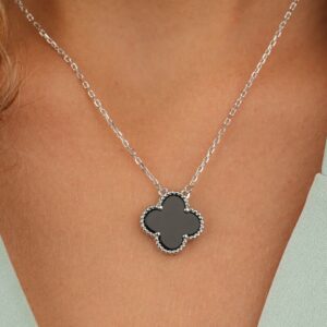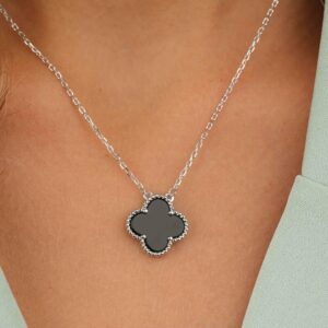 שרשרת כסף 925 עם תליון תלתן אלגנטי בגוונים קלאסיים של שחור וירוק. עיצוב עדין ונשי המשדר יוקרה וסטייל. תליון התלתן מוסיף נופך ייחודי ומיוחד, מתאים לשימוש יומיומי ולאירועים מיוחדים, ומשדרג כל הופעה עם נגיעה של אופנתיות ואלגנטיות. ✨