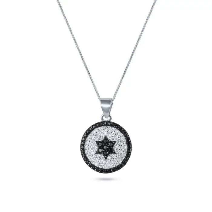 שרשרת כסף 925 תליון עגול משובץ מגן דוד בשחור ולבן